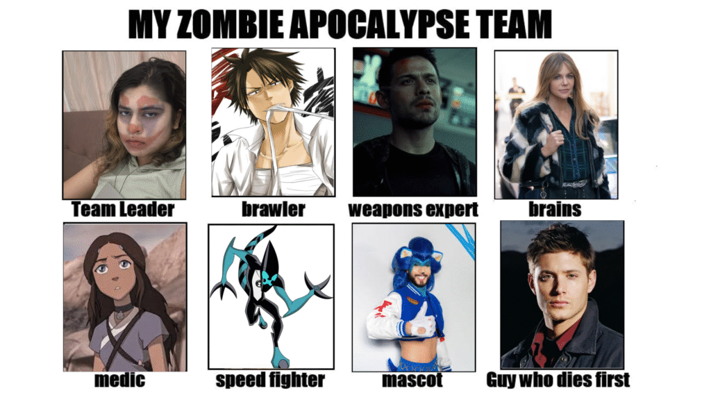 As I was going through some of my old cringe posts on Facebook, I came across the memes from that time. One of them? The Zombie Apocalypse Team meme template. Back then, my weeb self mostly filled it with anime characters (だってばよ).